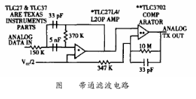 HART數(shù)字信號(hào)規(guī)范是峰值為1mA、平均值為0mA正弦交流電流信號(hào),此信號(hào)經(jīng)線路阻抗轉(zhuǎn)化為正弦交流電壓信號(hào),而HT2012輸入和輸出信號(hào)是0~5V的方波信號(hào),因此在HT2012和外部的HART信號(hào)之間還需要有濾波電路和整形電路。如圖3所示,由TLC27組成的濾波器是帶通濾波器,用來(lái)減少接收信號(hào)的噪聲干擾。濾波器還用來(lái)消除波形中的尖峰,從而使接收到的信號(hào)變得平緩。TLC37組成的數(shù)字方波產(chǎn)生回路把經(jīng)過(guò)TLC27濾波后的正弦波轉(zhuǎn)變成相應(yīng)的方波,以便于HT2012接收。