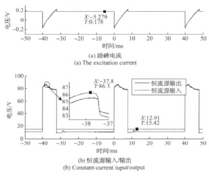 由圖7曲線結(jié)合圖2可知,在勵(lì)磁方向切換后,檢流電路檢測(cè)到的圖7(a)中的勵(lì)磁電流瞬間為負(fù),此時(shí)勵(lì)磁線圈處于電能泄放狀態(tài)并向能量反饋電路中的儲(chǔ)能電容充電。由于儲(chǔ)能電容充電,高、低壓切換電路的輸出電壓從80V逐漸升高;待勵(lì)磁線圈能量泄放完即勵(lì)磁電流為零時(shí),儲(chǔ)能電容兩端電壓達(dá)到*高86V并開(kāi)始放電,勵(lì)磁電流開(kāi)始上升;儲(chǔ)能電容電壓降低至80V時(shí),高低壓切換電路趨于80V的穩(wěn)定輸出狀態(tài),此時(shí)勵(lì)磁電流繼續(xù)上升;待勵(lì)磁電流上升至設(shè)定的超調(diào)量205 mA后,遲滯比較電路控制高低壓切換電路切換至17V低壓源作為勵(lì)磁工作電源,恒流電路在17V低壓源輸入下進(jìn)行恒流控制輸出。