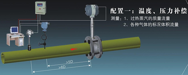 5、表體中同時集成溫壓補償補償功能,可測量流體的標(biāo)準(zhǔn)體積流量或標(biāo)準(zhǔn)質(zhì)量流量。