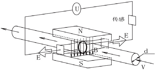 如圖,測量流量時,流體流過垂直于流動方向的磁場,導(dǎo)電性流體的流動感應(yīng)出一個與平均流速成正比的電勢。其感應(yīng)電壓信號通過兩個電極檢出,并通過電纜傳送至轉(zhuǎn)換器,經(jīng)過信號處理及相關(guān)運(yùn)算后,將累計流量和瞬時流量顯示在轉(zhuǎn)換器的顯示屏上。