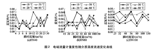將實驗測得的管道污水處理進出水口流量計在不同溫度及流速下的重復(fù)性數(shù)據(jù)整理,特性曲線如圖2所示,3組曲線分別對應(yīng)DN40,  DN80,  DN100的3塊管道污水處理進出水口流量計的重復(fù)性曲線。