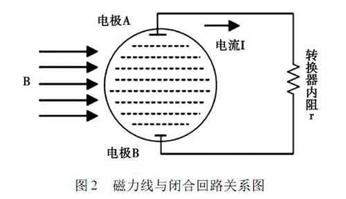 2. 1 正交干擾衛(wèi)生型卡箍電磁流量計的磁路系統(tǒng)包含有兩個勵磁線圈,而導管內的液體與傳感器電極及轉換器結構組成了一個閉合的回路,如圖2 所示。理論情況下,磁力線( 圖中B) 應與閉合回路相平行,但是由于裝配過程中的誤差,導致磁力線不可能完全平行于這一閉合回路,出現(xiàn)部分磁力線成一定角度穿過回路的現(xiàn)象,這引起了即使沒有液體流動的情況下,傳感器的電極上也會產生感應電動勢,就形成了正交干擾的基本形式。