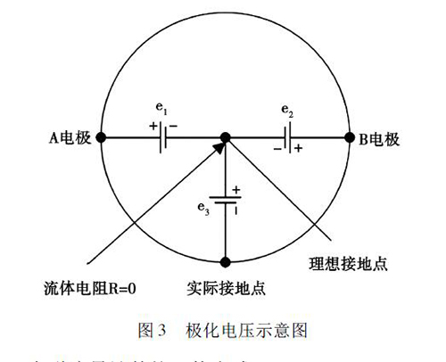 在被測(cè)液體與電極和接液部件接觸過(guò)程中,電解質(zhì)中的正負(fù)離子會(huì)分別作定向運(yùn)動(dòng),這會(huì)使被測(cè)液體在電極和接液部件之間形成電位差,通常將這種現(xiàn)象稱(chēng)為極化現(xiàn)象。如圖3 所示,理論上來(lái)說(shuō),兩電極A 和B 對(duì)接液部件的電位e1、e2大小相等、方向相反,此時(shí)兩電極的電位差等于零。但是,若兩電極的材質(zhì)或表面狀態(tài)存在差異,此時(shí)A、B 電極之間的電位差就不為零,這就形成了極化電壓,極化電壓與共模狀態(tài)的電壓e3一起疊加在流量信號(hào)中,被輸入轉(zhuǎn)換器的差動(dòng)放大器。當(dāng)極化電壓過(guò)大,則會(huì)對(duì)差動(dòng)放大器的輸入端造成較大影響,導(dǎo)致信號(hào)無(wú)法放大或流量信號(hào)的輸出波動(dòng)過(guò)大,從而降低了鹽水流量計(jì)的測(cè)量精度。