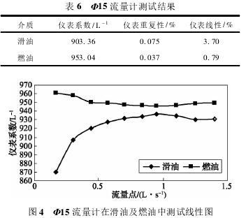 依據(jù)表5測試數(shù)據(jù),經(jīng)計算可得,Φ15流量計在滑油及燃油中測試結(jié)果如表6所示,測試線性圖如圖4所示。