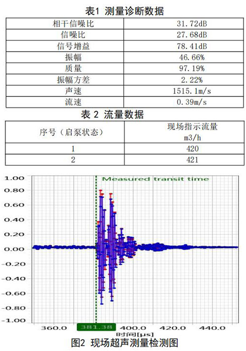 在高負荷段采用泵送補給水狀態(tài):測試時間 2018年10月11日,采用德國FLUEX高精度外夾式超 聲波流量計作為標準流量計,測量基礎(chǔ)數(shù)據(jù):管道 外徑276.93mm,管壁厚度12.40mm,采用兩聲程169mm傳感器安裝距離,通過對超聲波流量計信號 分析與診斷(數(shù)據(jù)見表1、表2和圖2),診斷數(shù)據(jù) 提示標準超聲波流量計測量狀況佳,檢測開始,啟 動補給水泵,運行一段時間流量穩(wěn)定后,測量結(jié)果 如下: