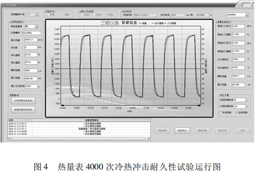 本文研究的 4000 次冷熱沖擊試驗(yàn)的實(shí)現(xiàn)具有以下特點(diǎn): (1)基于“工控機(jī) +水泵 + 化工污水流量計(jì)”的閉環(huán)控制系統(tǒng),實(shí)現(xiàn)了流量自動(dòng)反饋調(diào)節(jié),滿足試驗(yàn)要求; (2)通過四個(gè)開關(guān)閥的時(shí)序切換,自動(dòng)控制試驗(yàn)溫度,很好的完成了 4000 次溫度沖擊試驗(yàn); (3)通過“工控機(jī) + 數(shù)據(jù)數(shù)據(jù)采集卡”的數(shù)據(jù)采集系統(tǒng),實(shí)時(shí)監(jiān)控試驗(yàn)過程中的流量、溫度、壓力等相關(guān)參數(shù),實(shí)現(xiàn)試驗(yàn)方式的自動(dòng)控制,并能對(duì)試驗(yàn)數(shù)據(jù)進(jìn)行分析與評(píng)定。 (4)試驗(yàn)的全過程為智能自動(dòng)化,可無人員留守看護(hù)。試驗(yàn)結(jié)果可直接反映出熱量表在長時(shí)間運(yùn)行后的可靠性。為我國熱量表耐久性試驗(yàn)研究提供檢測(cè)手段,為促進(jìn)產(chǎn)品質(zhì)量提升做好技術(shù)保障。