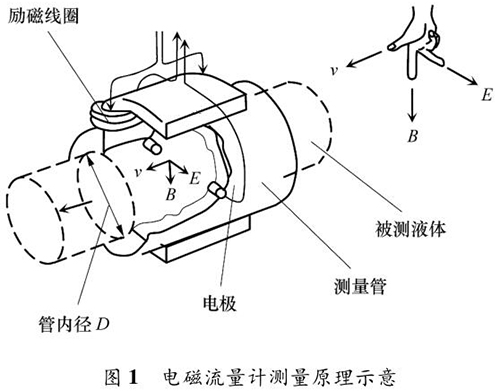 智能型防腐電磁流量計(jì)的測(cè)量原理如圖 1 所示。根據(jù)法拉*電磁感應(yīng)定律,導(dǎo)電液體在磁場(chǎng)中流動(dòng)會(huì)產(chǎn)生電動(dòng)勢(shì) E,它與磁感應(yīng)強(qiáng)度 B、導(dǎo)電液體平均流速 v 成一定比例關(guān)系:
