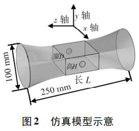 使用 Pro /E 軟件建立三維幾何模型,導(dǎo)入 COMSOL 軟件進(jìn)行有限元求解。仿真模型如圖 2 所示,電極連線為x 軸,連線中點(diǎn)為坐標(biāo)原點(diǎn),流體運(yùn)動方向?yàn)?z 軸,傳感器管道口徑為 DN100,總長250 mm。異徑管部分初始結(jié)構(gòu)尺寸 L = 80 mm,D = 80 mm,H = 40 mm,圓形電極半徑為17 mm,伸出絕緣襯里的*大距離為 1. 5 mm。