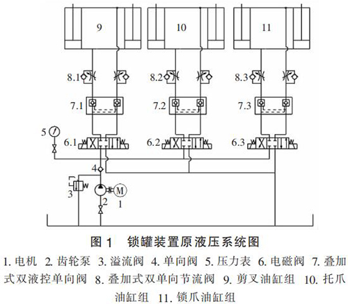 氪氣流量計原液壓系統(tǒng)圖如圖 1 所示。 通過分析圖 1 發(fā)現(xiàn),原液壓系統(tǒng)中剪叉油缸組、托爪油缸組及鎖爪油缸組并聯(lián)安裝,并均由齒輪泵供油,該系統(tǒng)設(shè)計簡單,液壓元件選擇不夠合理,工作效率低,電機(jī)發(fā)熱大,主要存在的問題: