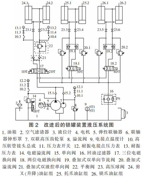 (2)由于升降油缸和托、鎖爪油缸的工況不同,所需油壓也不同,原液壓系統(tǒng)中齒輪泵統(tǒng)一供油,整個工作過程中系統(tǒng)功率消耗大,不夠節(jié)能,工作電機(jī)始終帶載運(yùn)行,不僅功率損耗大,而且易引起油溫急劇增加,對整個提升系統(tǒng)及液壓系統(tǒng)的性能和壽命造成惡劣影響;
