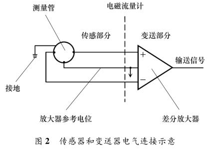 乙醇管道流量計主要由兩部分組成:流量傳感器和信號變送器,如圖 2 所示。傳感器上的勵磁線圈接受變送器傳輸來的勵磁電流產(chǎn)生磁場,輸出感應(yīng)電動勢信號;信號變送器則將感應(yīng)電動勢信號轉(zhuǎn)換為流量信號或模擬量信號送至控制系統(tǒng)。乙醇管道流量計按組成方式分為一體式和分體式。乙醇管道流量計穩(wěn)定工作另外一個重要條件是接地。當(dāng)流體流動穿過磁場時,以導(dǎo)電流體本身作為參考電位,在測量管一側(cè)電極產(chǎn)生正電勢,另一側(cè)產(chǎn)生負(fù)電勢,形成電勢差。但此電動勢信號一般只有幾毫伏,易受外界干擾。為防止干擾,將參考電位接入大地作為零電位,保證傳感器輸出精確穩(wěn)定的信號。傳感器和轉(zhuǎn)換器的接地端必須與被測介質(zhì)同電位,才能構(gòu)成對稱的輸入輸出回路。