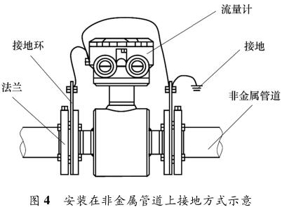 乙醇管道流量計安裝在金屬管道上,安裝時將金屬管道與乙醇管道流量計相連接,接地線再接入接地網(wǎng),如圖 3 所示。
