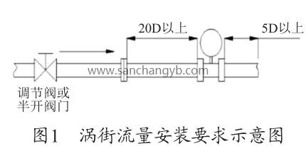 根據(jù)圖1渦街流量安裝要求示意圖及廠家的設(shè)備說明書要求,流量計(jì)上游的直管段長度至少為20D≈1 600mm,下游的直管段至少在5D≈400mm,D=80mm 為管道直徑。圖2為現(xiàn)場安裝圖,流量計(jì)上游僅為600mm <1 600mm,此流量計(jì)安裝位置有誤,對測量值有一定的影響,造成測量偏差,需調(diào)整流量計(jì)的安裝位置。