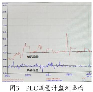 通過圖3可以看出,PLC 上輔汽測量用的脫硫煙氣流量計(jì)的量程設(shè)置為30t/h,現(xiàn)場設(shè)備量程實(shí)際為5t/h,兩者嚴(yán)重不符,因此測量值8.286t/h 為錯(cuò)誤值,需要對程序進(jìn)行修改。