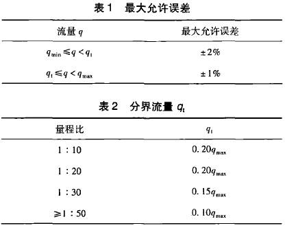 在GB21391--2008《用氣體渦輪流量計(jì)測(cè)量天然氣流量》對(duì)分界流量q,有明確的定義,即低于該流量要采用擴(kuò)展誤差限的流量值。標(biāo)準(zhǔn)*5.2條從*大允許誤差和量程比兩方面對(duì)分界流量做出了規(guī)定,且明確了量程比是在*大允許誤差范圍內(nèi)流量計(jì)的*小流量和*大流量之比。該標(biāo)準(zhǔn)中對(duì)渦輪流量計(jì)要求的*大允許誤差如表1所示,量程比與分界流量q,的關(guān)系如表2所示。