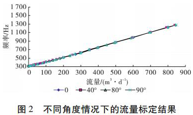 為了考察井眼斜度變化對(duì)電磁流量計(jì)測(cè)量流量的影響,開(kāi)展了非集流高壓電磁流量計(jì)在不同斜度情況下的流量測(cè)量模擬實(shí)驗(yàn)。模擬實(shí)驗(yàn)在大慶油田多相流實(shí)驗(yàn)室進(jìn)行,儀器外徑 38 mm,模擬井筒內(nèi)徑為 124 mm,實(shí)驗(yàn)介質(zhì)是水,傾斜角度分別為 0°、40°、80°和 90°( 水平) ,流量范圍為 5 ~ 850 m3 /d。實(shí)驗(yàn)結(jié)果表明,在儀器居中條件下,井眼斜度變化對(duì)電磁流量計(jì)的儀表常數(shù)沒(méi)有影響,滿量程誤差不大于 4% ,因此可以應(yīng)用高壓電磁流量計(jì)進(jìn)行水平井注水剖面測(cè)量。不同角度情況下的實(shí)驗(yàn)結(jié)果如圖 2 所示。