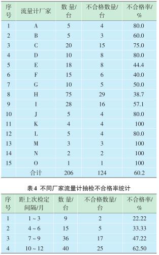 2018年選取100臺氣體流量計按照其檢定后的使用時間進行了統(tǒng)計,其不合格率統(tǒng)計見表4。從表4中可以看出,5個月之后流量計的使用誤差出現(xiàn)較大偏差,檢定不合格率明顯增加。