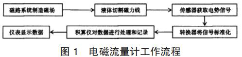 智能渦輪流量計(jì)的產(chǎn)生主要是基于法拉*電磁感應(yīng)定律。在智能渦輪流量計(jì)的應(yīng)用中,磁路系統(tǒng)會(huì)在流量計(jì)運(yùn)行過(guò)程中逐步出現(xiàn)直流磁場(chǎng)與交流磁場(chǎng),該磁場(chǎng)的產(chǎn)生為后期的測(cè)量提供了良好的前提條件,營(yíng)造了測(cè)量所需的磁場(chǎng)環(huán)境,因此,在智能渦輪流量計(jì)應(yīng)用時(shí),一旦被測(cè)液體在導(dǎo)管中經(jīng)過(guò)該磁場(chǎng)環(huán)境時(shí),必然會(huì)產(chǎn)生一定的切割磁力線運(yùn)動(dòng),在這種情況下,電極傳感器就會(huì)發(fā)揮其作用,將導(dǎo)管內(nèi)的流量轉(zhuǎn)換為感應(yīng)電勢(shì)信號(hào),隨后此轉(zhuǎn)換形成的信號(hào)逐步被傳遞給轉(zhuǎn)換器。而轉(zhuǎn)換器更是可以將所獲得的流量信號(hào)等加以處理,通過(guò)分析、對(duì)比等,轉(zhuǎn)換器會(huì)將該信號(hào)變?yōu)闃?biāo)準(zhǔn)信號(hào),隨后將該信號(hào)輸出給積算儀,進(jìn)一步進(jìn)行信號(hào)的處理,這些處理以后的信號(hào)*終會(huì)在智能渦輪流量計(jì)的儀表中顯示,呈現(xiàn)*終的流量測(cè)量結(jié)果,其基本的流程如圖 1 所示。